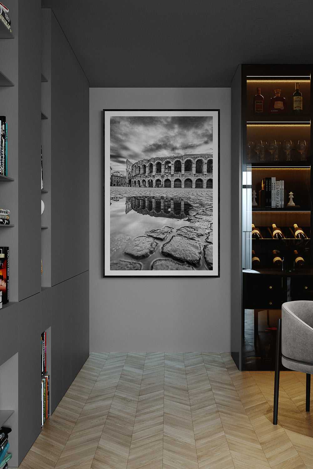 In this vertical image, the Arena of Verona dominates the scene, reflected in a puddle after a storm. The low and close-up viewpoint emphasizes the texture of the pavement and the geometry of the arches, creating a balance between solidity and reflection. The dramatic, contrast-filled sky adds intensity and harmony to the scene, turning the photograph into a powerful tribute to the city and its ancient architecture.